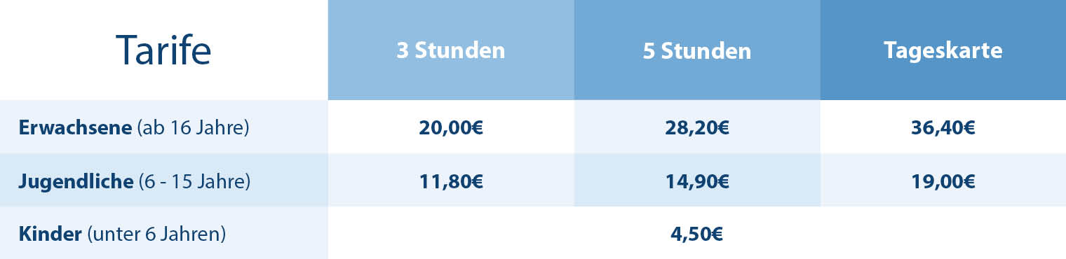 Familientarif: Bei 2 zahlenden Erwachsenen in Begleitung von bis zu 4 Kindern (bis 15 Jahre) haben das 2. Kind und 4. Kind „Freien Eintritt“